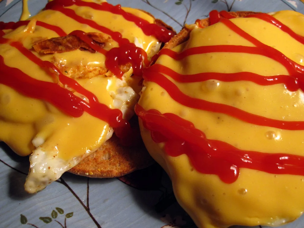 One of life's simplest pleasures. Shown here complete with sandwich thin, American cheese, garlic salt, ground red pepper, ketchup and egg, of course. Almost daily breakfast. Cholesterol, psh.